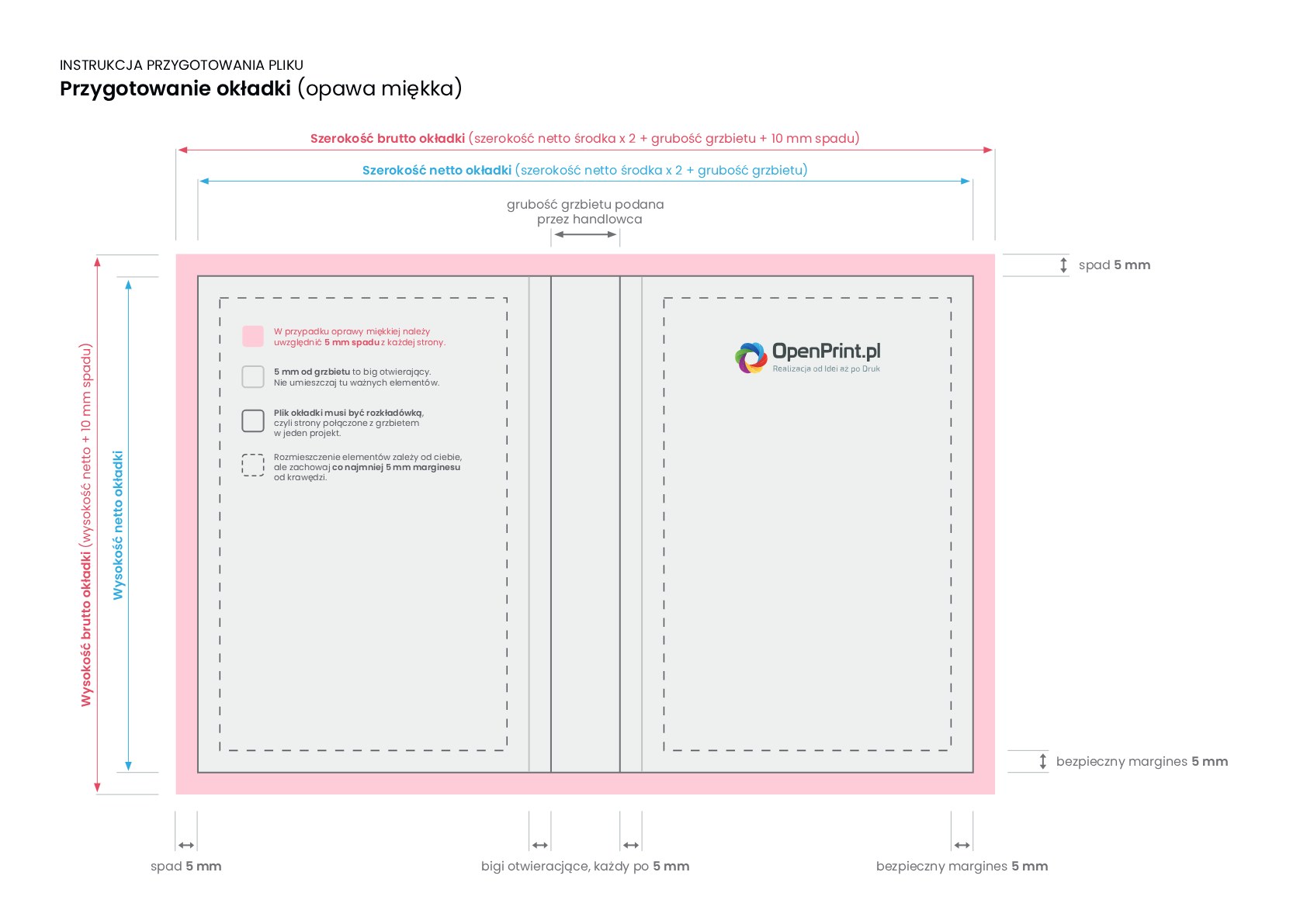 W przypadku oprawy miękkiej plik musi zawierać front, tył oraz grzbiet połączone w jeden projekt. Najważniejszym elementem technicznym są bigi otwierające. Znajdują się one w odległości 5 mm od krawędzi grzbietu (po obu stronach). W tym obszarze nie należy umieszczać istotnych elementów, takich jak teksty czy logotypy, ponieważ w tym miejscu okładka będzie się łamać podczas otwierania.